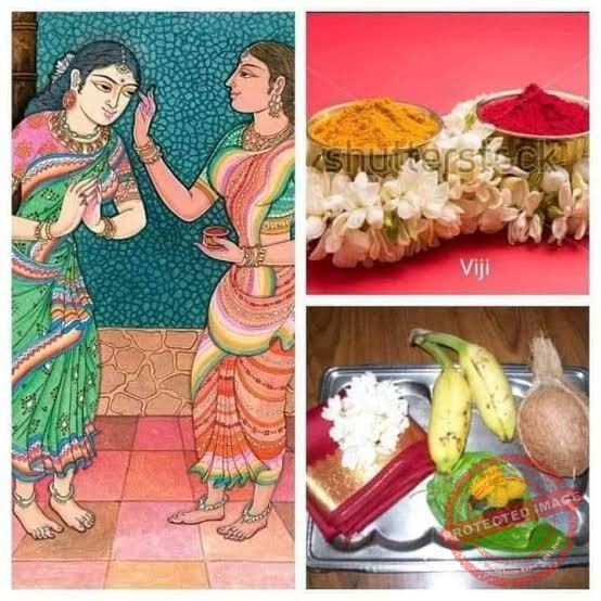 வெற்றிலை,பாக்கு,மஞ்சள்,குங்குமம்,சீப்பு,முகம் பார்க்கும் கண்ணாடி வளையல்,மஞ்சள்கயிறு,தேங்காய், பழம்,மலர்,மருதாணி,கண்மை, தட்சணை, ரவிக்கைத்துணி அல்லது புடவை.