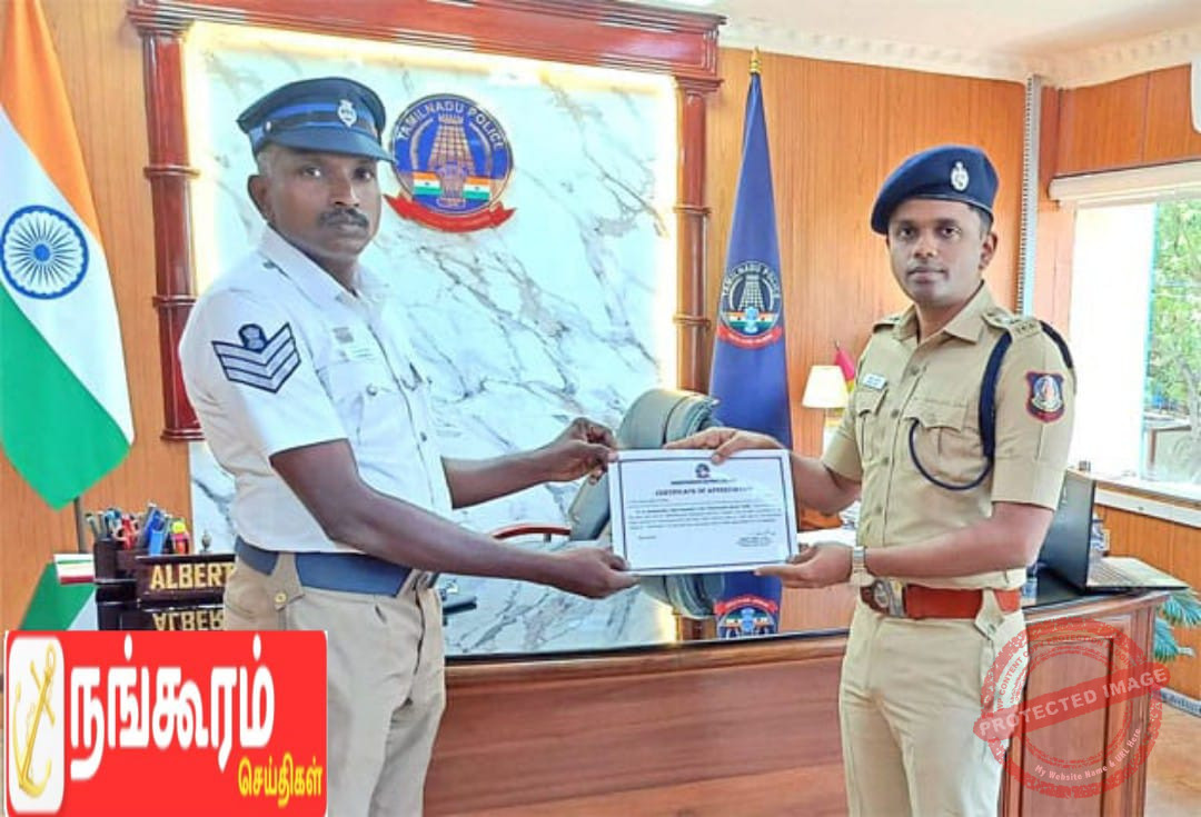 தூத்துக்குடியில் குற்றம் சம்பந்தப்பட்ட பல வழக்குகளில் தொடர்புடையவரை விரட்டி பிடித்த போக்குவரத்து தலைமை காவலருக்கு மாவட்ட காவல் கண்காணிப்பாளர் ஆல்பர்ட் ஜான் சான்றிதழ் வழங்கி பாராட்டு தெரிவித்துள்ளார்.