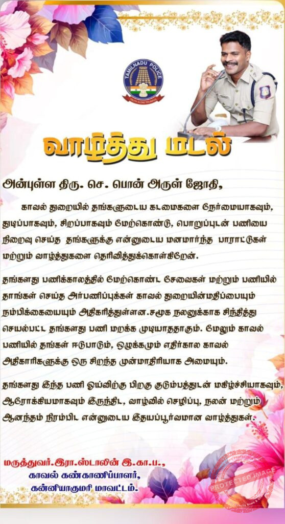 காவல் பணியில் தங்கள் ஈடுபாடும், ஒழுக்கமும் எதிர்கால காவல் அதிகாரிகளுக்கு ஒரு சிறந்த முன்மாதிரியாக அமையும் என பாராட்டு.