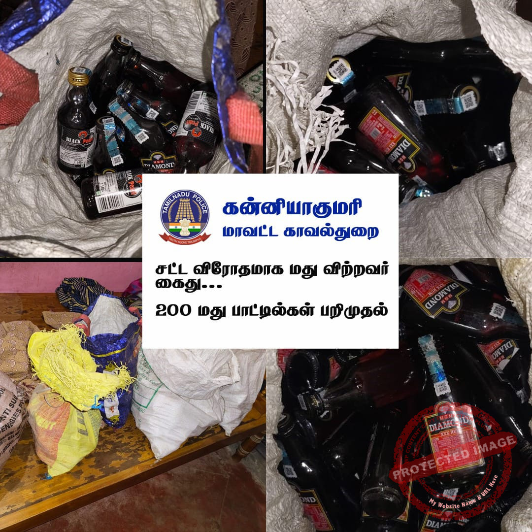 தென்தாமரைக்குளம் காவல் நிலைய காவலர்கள் இலந்தையடிவிளை பகுதியைச் சேர்ந்த எமகாலப்பெருமாள் என்பவரது மகன் ஞான சுரேஷ், (வயது 45) என்பவரது வீட்டில் சோதனை செய்த போது அவரது வீட்டில் 200 மது பாட்டில்கள் விற்பனைக்காக பதுக்கி வைக்கப்பட்டு இருந்தது தெரியவந்தது. இதனைத் தொடர்ந்து அவரை கைது செய்த காவல்துறையினர் அவர் மீது வழக்கு பதிவு செய்து மது பாட்டில்களை பறிமுதல் செய்தனர்.