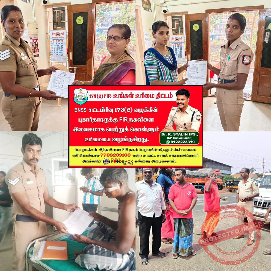 கடந்த குடியரசு தினத்தன்று, கன்னியாகுமரி மாவட்ட காவல் கண்காணிப்பாளர் டாக்டர். ஆர். ஸ்டாலின் IPS அவர்கள், பொதுமக்களின் சட்ட உரிமைகளை உறுதி செய்யும் நோக்கில் 173(2) FIR – உங்கள் உரிமை திட்டத்தை தொடங்கி வைத்தார்கள்.