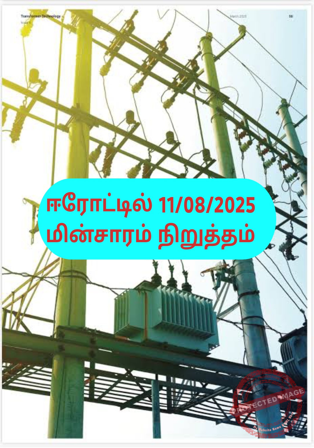 ஈரோட்டில் (11.08.2025) திங்கள் கிழமை மின்வாரியம் சார்பில் மாதாந்திர மின்சார பராமரிப்பு பணிகள் நடைபெற உள்ளன. இதனால், பல்வேறு பகுதிகளில் காலை 09:00 மணி முதல் மாலை 5:00 மணி வரை மின்சாரம் நிறுத்தப்படும்.