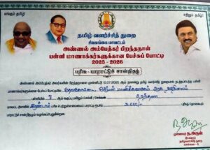 தமிழ் வளர்ச்சி துறையின் சார்பில் டாக்டர் அண்ணல் அம்பேத்கார் பிறந்த நாள் விழாவினை முன்னிட்டு நடைபெற்ற பள்ளி மாணவர்களுக்கான பேச்சுப்போட்டியில் இப்பள்ளி மாணவி நந்தனா மாவட்ட அளவில் இரண்டாமிடத்தில் வெற்றி பெற்று சாதனை படைத்துள்ளார்.
