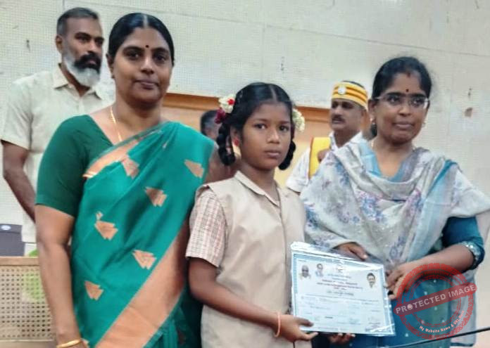 மாணவிக்கு சிவகங்கை மாவட்ட ஆட்சியர் பொற்கொடி ரூபாய் மூவாயிரம் பரிசுக்கான காசோலையும் மற்றும் பாராட்டுச் சான்றிதழும் வழங்கினார்.