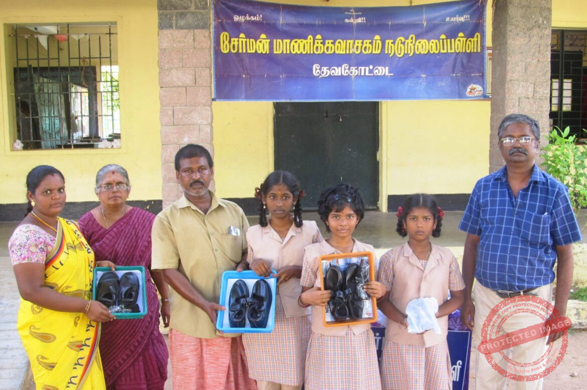 சிவகங்கை மாவட்டம், தேவகோட்டை சேர்மன் மாணிக்க வாசகம் நடுநிலைப் பள்ளியில் தமிழக அரசின் இலவச காலணிகள் மற்றும் ஷீக்கள் பள்ளி மாணவர்களுக்கு வழங்கியுள்ளனர்.
